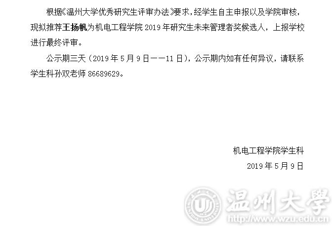 关于开云体育 2019年研究生未来管理者奖候选人评选结果公示