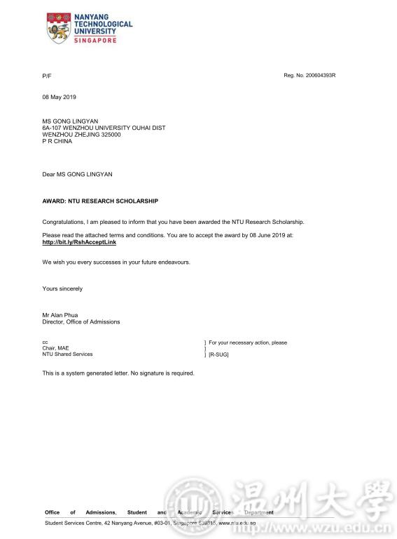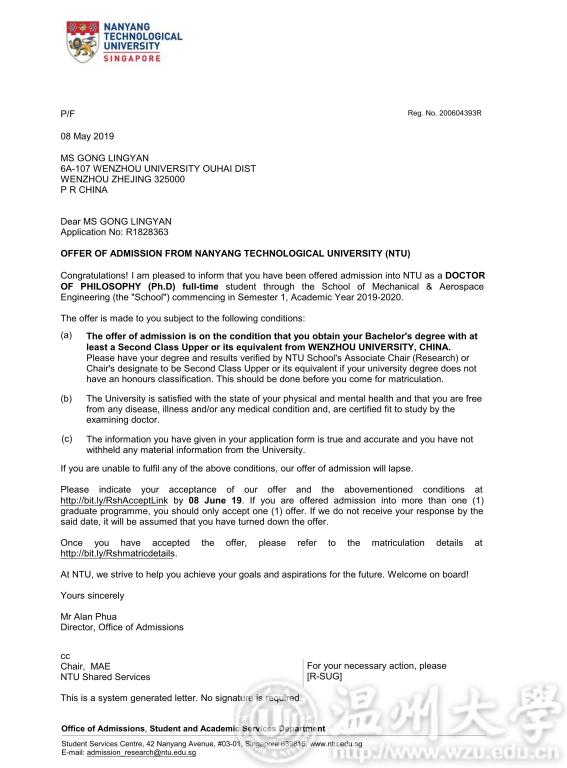 据悉,南洋理工大学(Nanyang Technological University),简称南大(NTU),是新加坡的一所世界著名研究型大学。最新QS世界大学排名第12名, QS世界年轻大学排名连续多年位列第一。龚玲艳作为一名普通本科毕业生能够收获南洋理工大学伸出的全奖博士录取橄榄枝,实在难能可贵,这也是我校加强本科教育,始终坚持以本为本,重视人才培养的结果。