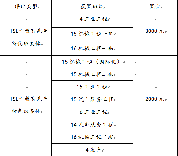 “TSE”教育基金由宁波兴茂电子科技有限公司出资设立,特别设置了特优班集体和特色班集体奖项。特优、特色班集体评比涉及学风建设、学生团建、科技竞赛、创新创业、考级考证、新闻宣传以及考研就业七个特色项目。经过前期各班申报、年级委员会初评和学院审核筛选,本次评比大会总共有12个班级参与评选,其中特优班集体候选6名,特色班集体候选6名。经过评比大会,教师评委和学生评委投票,最终评选出14工业工程、15机械1班、16机械1班3名特优班集体和15机械国际化等8名特色班集体。名单如下: