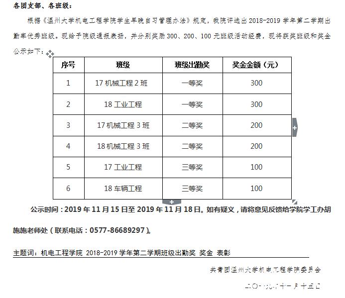 关于开云体育 2018-2019学年第二学期出勤奖励的公示