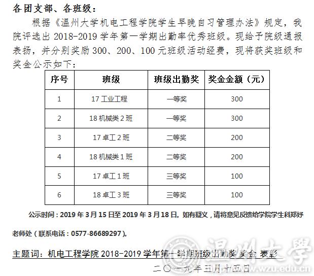 关于开云体育 2018-2019第一学期出勤奖励的公示