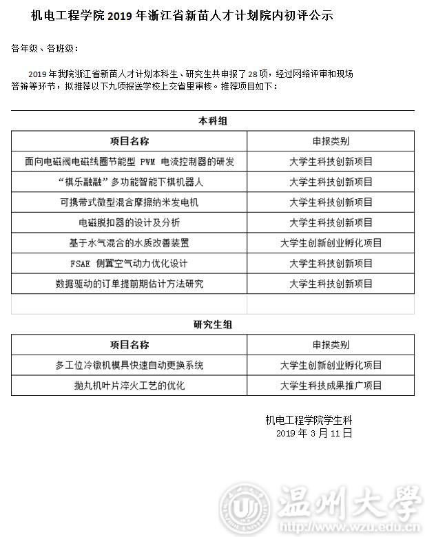 开云体育 2019年浙江省新苗人才计划院内初评公示