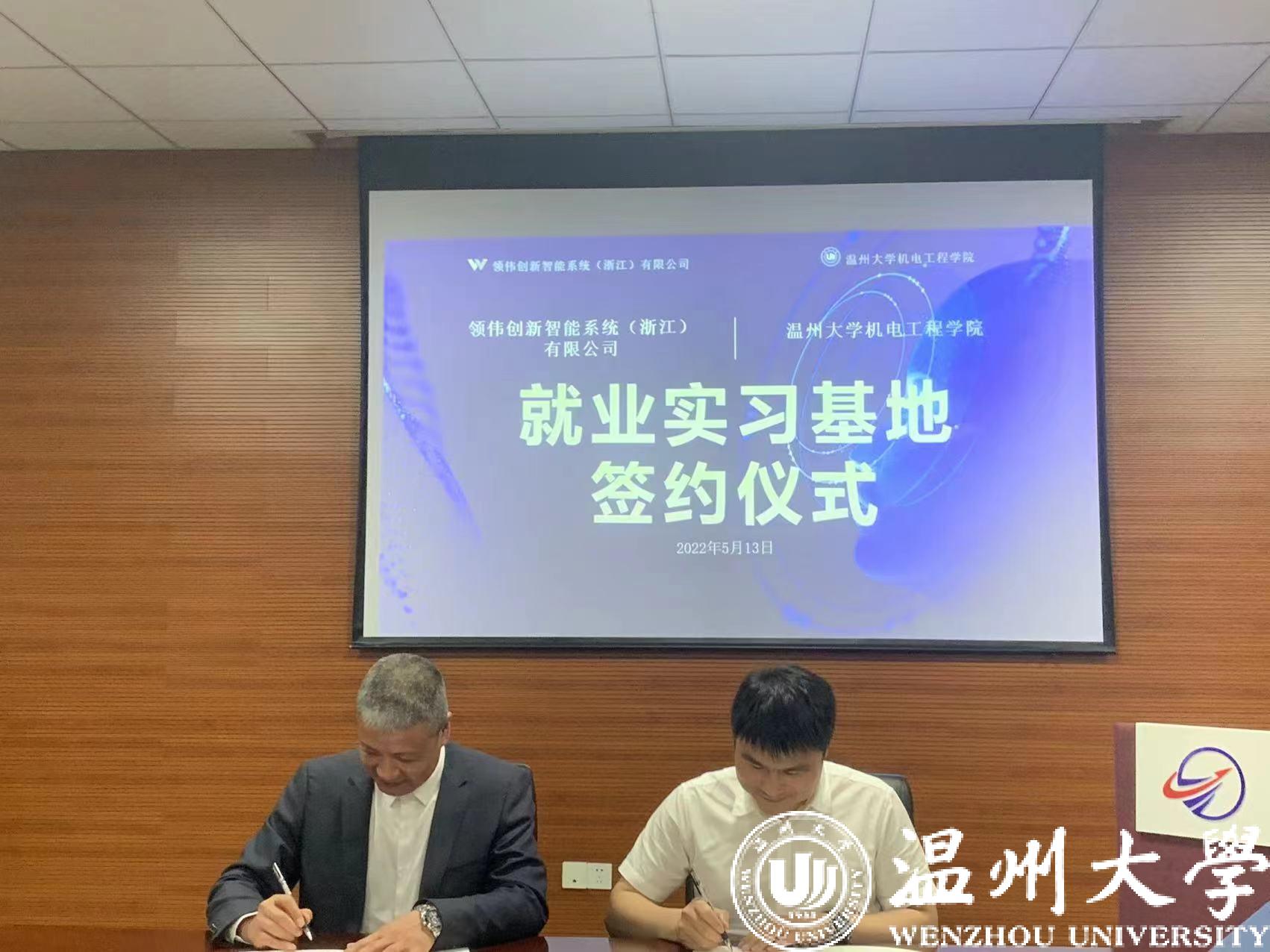 周荣书记、李小刚董事长代表校企双方签订就业实习合作协议,周荣书记向领伟创新智能系统(浙江)有限公司授牌,正式在该公司建设“温州大学就业实习基地”。