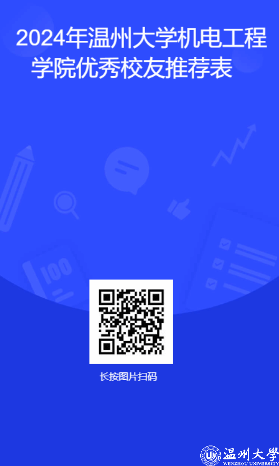 欢迎广大校友直接向学院推荐他人或自荐,不限名额,应推尽推。推荐单位和个人请填写《温州大学开云体育 优秀校友推荐表》(见二维码),请在11月30日之前完成推荐。