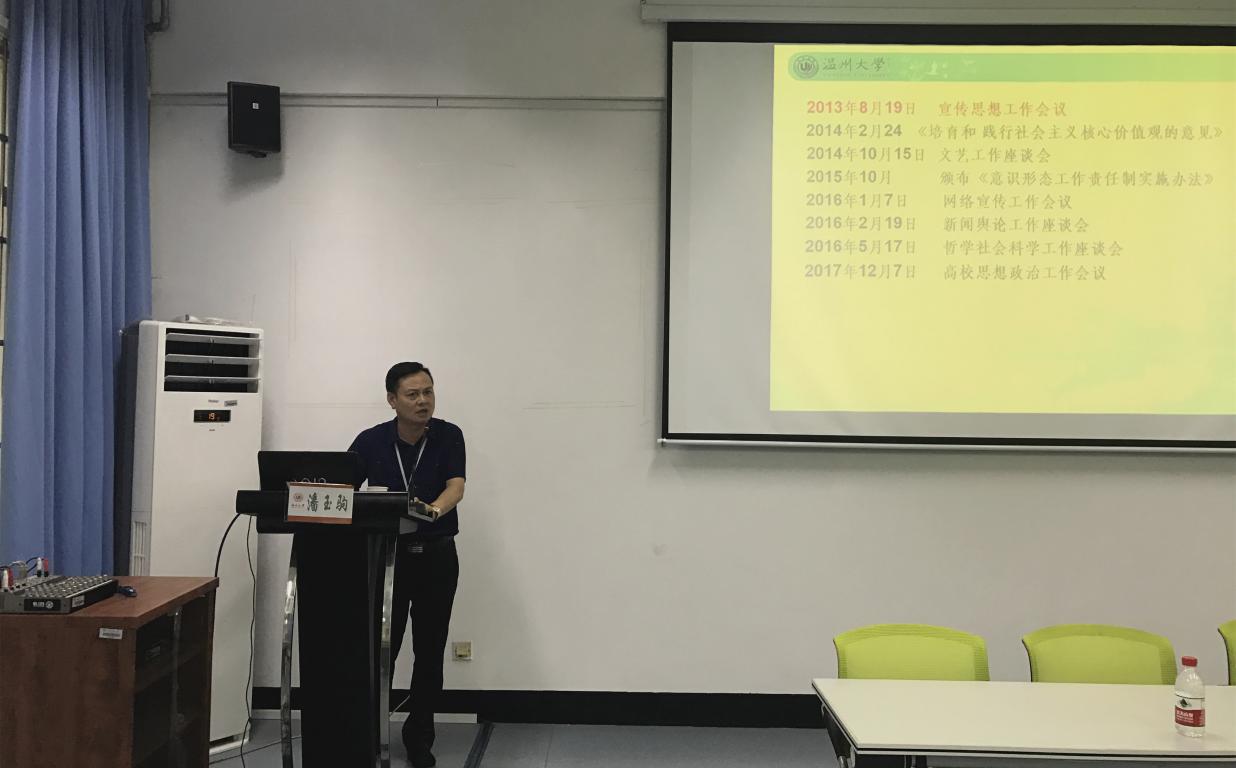 2018年6月20日下午,开云体育 召开教师理论学习会,邀请学校党委委员、党委宣传部部长潘玉驹作题为《牢牢把握意识形态领导权主动权》的主题报告。学院教职工参加了学习会,党总支书记周荣主持。
