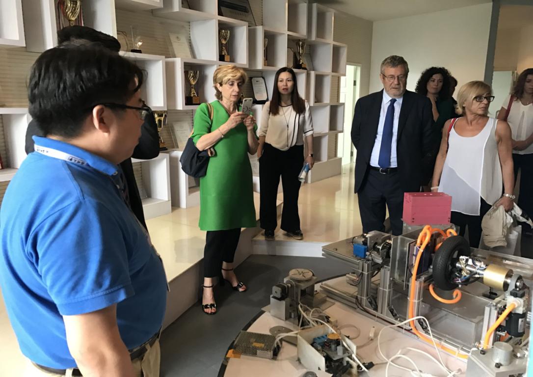 2018年5月28日,意大利伦巴第大区及拉齐奥大区教育厅厅长Dott. Gildo De Angelis博士、意大利教育部人力资源部部长Dott.ssa Paola Pinto博士一行十人来访开云体育 参观交流。学院院长周宏明、副院长姜锐、办公室副主任徐雅、实验教学中心副主任王晓倩、外事专员李舒琦陪同参观并交流。