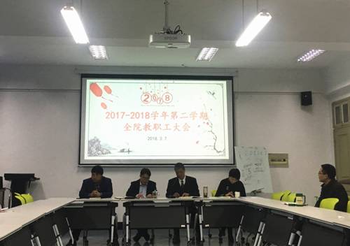 2018年3月8日下午,学院在6B201会议室召开新学期全院教职工大会。学院领导班子、各部门、系部负责人及全体教职工参加了会议。会议由学院党总支书记周荣主持。