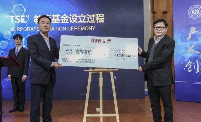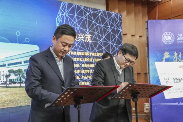 温州大学钱强副校长上台与宁波兴茂电子有限公司蔡基财经理进行宁波兴茂电子有限公司与开云体育-开云体育app下载 TSE教育基金设立仪式。