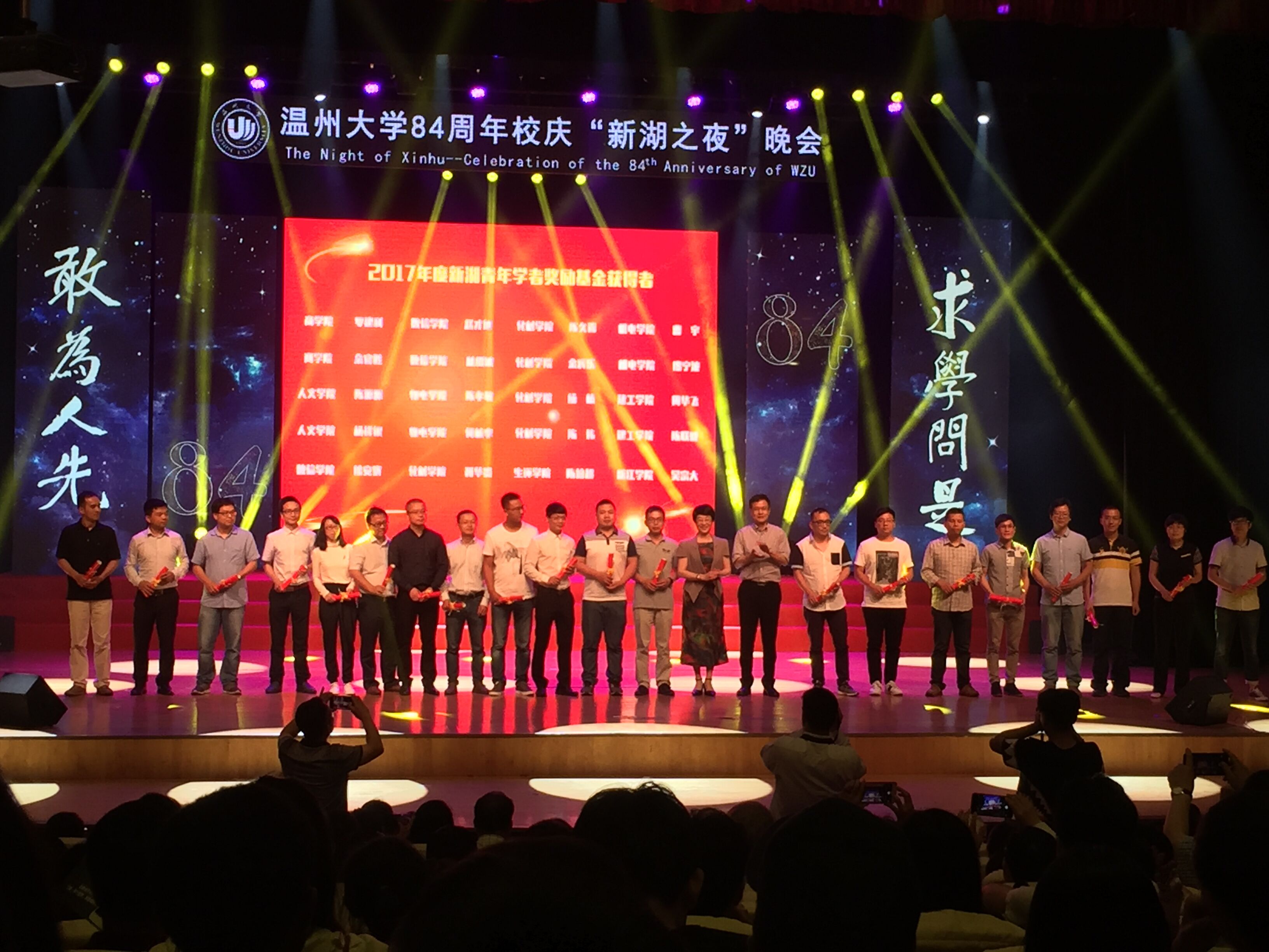 5月19日晚,温州大学84周年校庆“新湖之夜”晚会暨第25届校园文化节开幕式在育英大礼堂隆重举行。晚会上,对2017年度新湖青年学者奖励基金获得者、2017年度“青春开云体育 ”榜样人物进行了表彰。开云体育 曹宇、廖宁波两位老师喜获2017年度新湖青年学者奖励基金,并接受校党委书记林娟娟和浙江新湖(控股)集团董事长黄伟的颁奖。