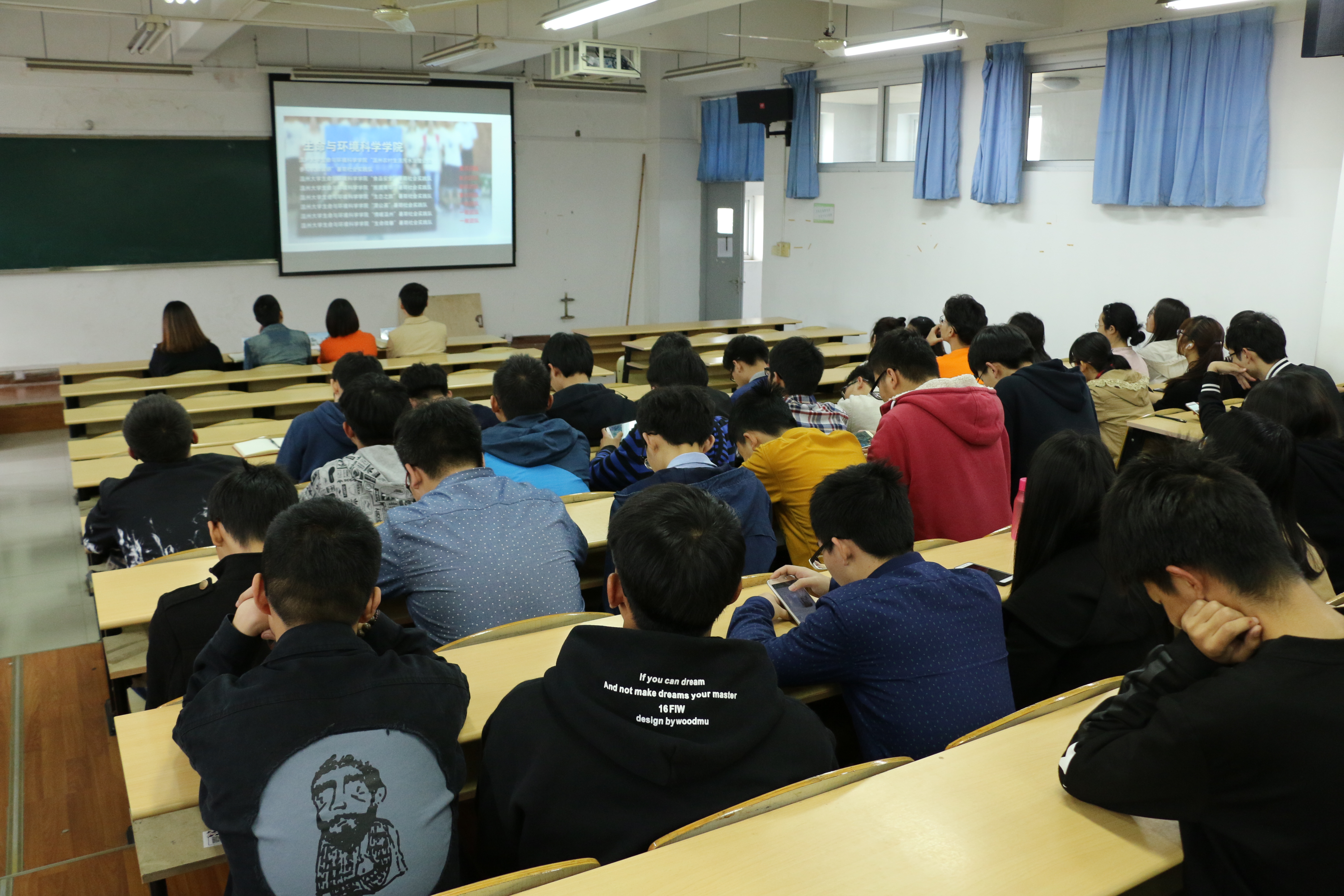 介绍完了暑期社会实践,团委学生会副主席裘黎明上台发表了自己对暑期社会实践的看法,结合自己的亲身经历,他认为虽然暑假他只放了4天的假期,但他在实践中收益了很多,一切都是值得的。辅导员金老师联系了上学期的成绩情况,为同学们拉响了警钟,在体验实践的过程中也不能忘了学业,并让学院年级委员会胡琴同学报告了关于英语四六级考核通过率的情况。