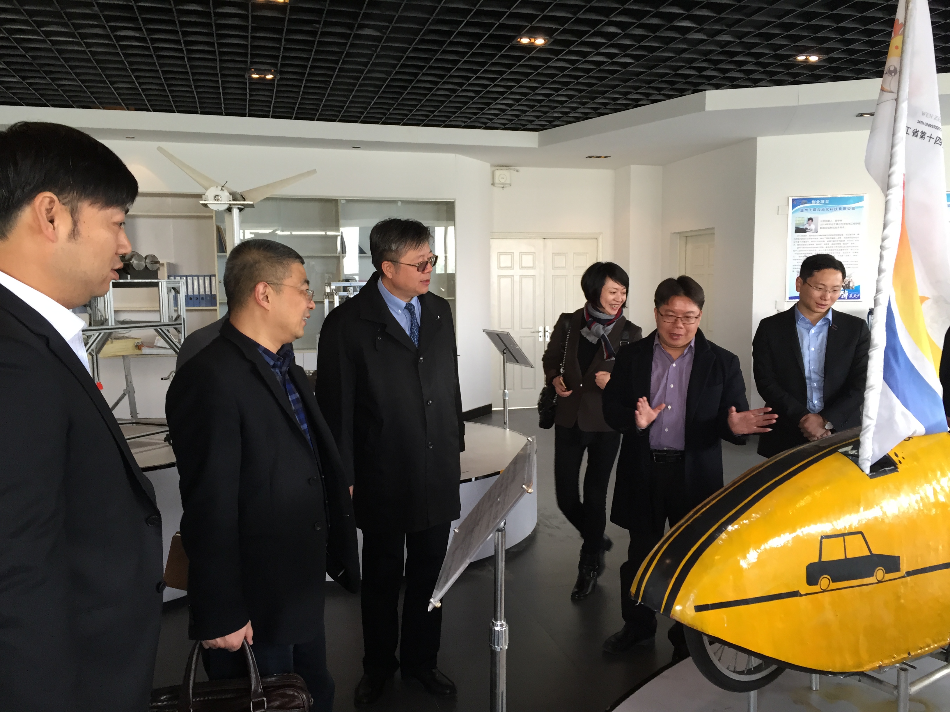 在学生科技创新成果展示厅,来访嘉宾对学生科技创新作品表示了浓厚兴趣,余杭经济技术开发区管委会创业创新局局长李瑛表示,希望能与学院加强创新创业方面的对接与合作,共同促进两地创新创业发展工作。