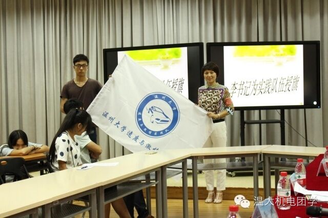 李密副书记为出征仪式致辞。她指出,社会实践是大学生受教育、长才干、作贡献,增强社会责任感的重要途径。她希望同学们能够虚心学习,勇于创新,结合学院特色和当下热点做好方案策划工作;深入基层,脚踏实地,在服务地方经济建设、构建和谐社会的实践中提高自身素质;不怕吃苦,克服困难,激发自己的“敢劲”和“干劲”;牢记使命,增辉学院,以实际行动展现学校学子积极进取、健康向上的精神风貌。辅导员孙双老师重申了安全、宣传及后期总结的相关注意事项。随后,李密副书记为实践队进行了授旗仪式。