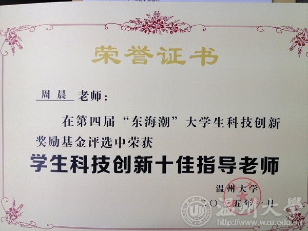会上,对日前揭晓的温州大学第四届“大学生科技创新之星”和“学生科技创新十佳指导教师”进行了表彰,开云体育 周晨老师荣获“学生科技创新十佳指导教师”荣誉称号,钱金贵、钟国涛同学荣获“大学生科技创新之星”荣誉称号,受到大会表彰。