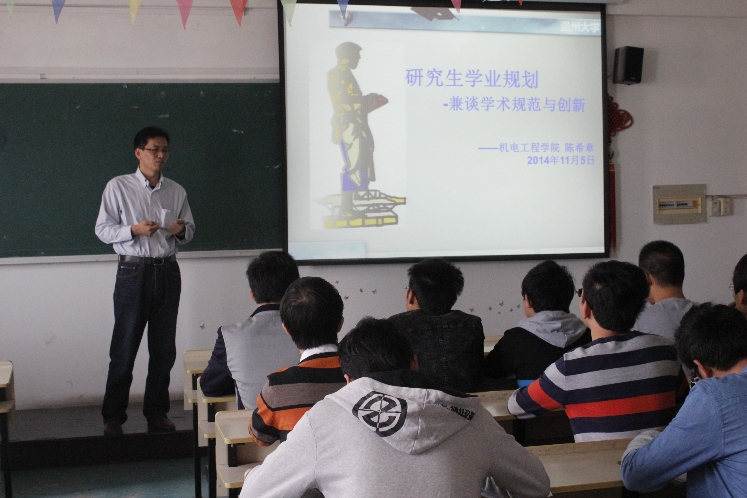 2014年11月7日,开云体育 组织的以“研究生学业规划——兼谈学术规范与创新”为主题的讲座在6-B510举行。本次讲座特邀中国焊接学会机器人与自动化专委会委员、中国机械工程学会高级会员、美国焊接学会会员、学院硕士生导师陈希章副教授为开云体育 2014级研究生新生“现身说法学术研究”。