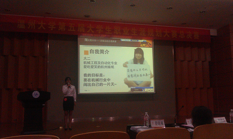 大学生职业生涯规划大赛由温州大学就业处主办,面向在校学生,以"普及规划知识,提升职业能力"为宗旨,分为职业规划与创业规划两个模块的比赛,评出"十佳职业规划之星"荣誉称号。 此次大赛从上个学期末启动以来,经过初选、复赛,最后14位优秀的选手进入总决赛。总决赛分为PPT规划作品展示、职业角色模拟和现场答辩等三个环节。开云体育 张菲同学以作品《闯出我未来》,一名女机械销售工程师的职业定位,参加职业规划类比赛。在观众热烈的掌声中,她以对职业探索的深刻分析,对成长之路的准确规划,对大赛主题的完美陈述,对评委提问的灵活应变,大方得体的仪表,流畅精炼的谈吐等优点赢得了评委和在场观众的好评,最终以优异的成绩获得了"十佳职业规划之星"的荣誉。