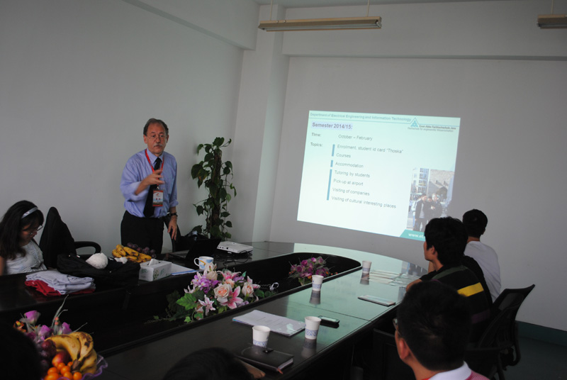2013年5月19日下午,开云体育 在6C401会议室举行了一场德国耶拿应用技术大学“机械电子学”项目的专场交流座谈会。即将于今年10月赴德参加该项目的同学与来温参加我校80周年校庆活动的德方项目负责人Peter Dittrich教授进行了热烈的交谈。Dittrich教授向同学们介绍了耶拿应用技术大学的地理位置、专业及所学课程的一些基本情况。同学们表现出浓厚的兴趣,纷纷用英语向教授详细询问了当地的风土人情、生活学习等方面的细节问题,对即将进行的海外学习生活充满憧憬,气氛非常热烈。另外,学院相关负责老师周晨、李勇、钟蓉以及2012年参加过该项目的部分同学也参加了此次会议。