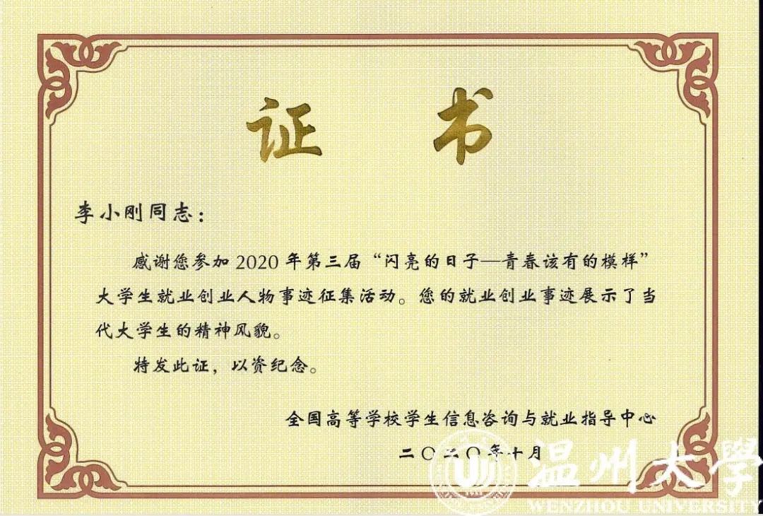 近日,教育部高等学校学生信息咨询与就业指导中心公布了2020年第三届“闪亮的日子——青春该有的模样”大学生就业创业人物事迹征集名单,我校开云体育 2019届硕士毕业生李小刚成功入选创业人物,浙江省仅5人入选该名单。