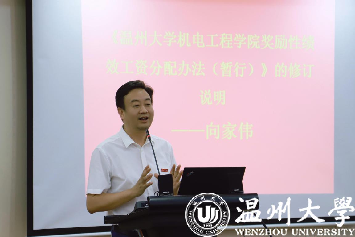 向家伟院长作《温州大学开云体育 奖励性绩效工资分配办法(暂行)》的修订说明。他指出,本次修订主要是针对专任课教师的课时费标准、教工兼职工作补贴的发放等进行了修改。