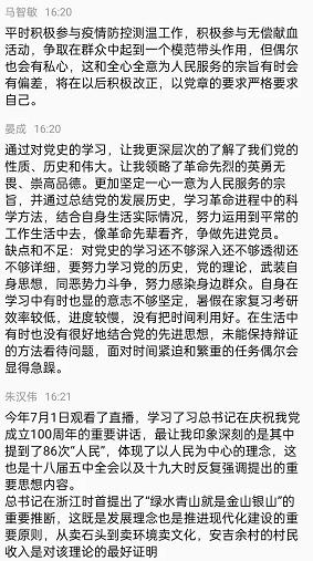 傅镜霏同志对照党史学习教育目标发言,“通过党史学习,更加坚定了共产主义理想信念,中国特色社会主义制度优越性的信念,增强了以史明理、以史崇德、以史力行的自觉性。培养了以党的历史思维,自觉按照历史规律和历史发展的辩证法做事的决心和信心。但仍存在差距与不足: 一是学习的深度、系统性还需加强,要不间断的学习提高;二是历史学习与当前工作的结合上,更要充分的思考和运用,做到学以致用,充分发挥我党的优良传统;三是要敢于为人先,充分论证工作方式方法的正确性,敢于担当,敢于同不切实际的人与事表达不同意见,坚持党性与原则”。