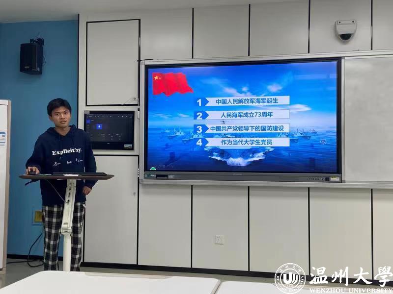 本科生第四党支部戚成凯同志带领大家学习了《庆祝中国海军节与中国共产党领导下的国防建设》,周林丹同志带领大家学习了《“奋进新征程,建功新时代”——学习2022年全国两会精神》