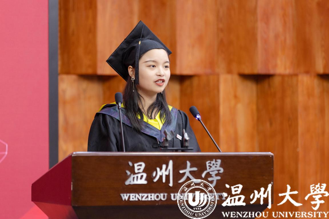 大会第四项议程,傅镜霏同学代表学院全体毕业生发言,她回忆了在校生活的点点滴滴,并对向辛勤付出的老师表达了感激之情。在她的发言中,感受到了学子对母校的依依不舍,感受到了浓浓同窗情、师生情。