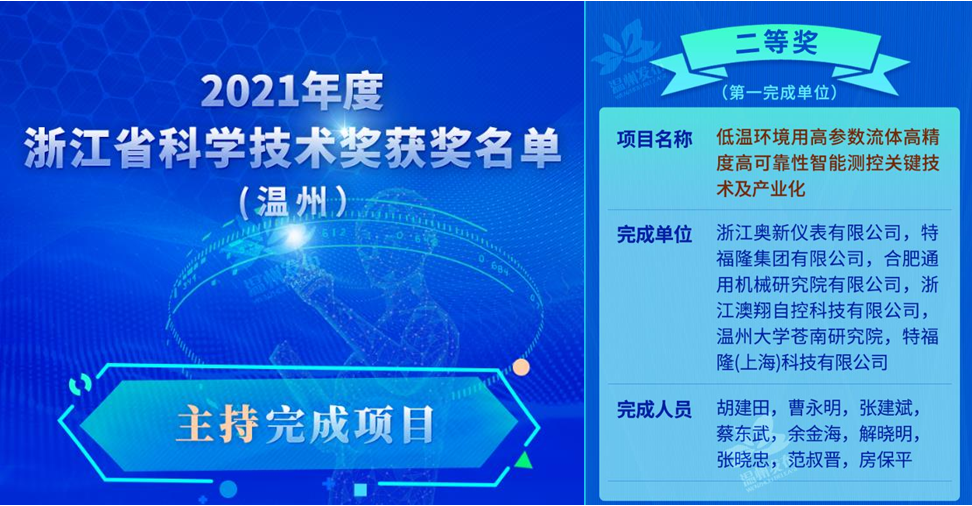 近日,浙江奥新仪表有限公司与温州大学苍南研究院等单位合作的“低温环境用高参数流体高精度高可靠性智能测控关键技术及产业化”项目荣获浙江省科学技术进步奖二等奖。从2018年开始,温州大学苍南研究院张淼教授领衔的智能仪器仪表技术团队与浙江奥新仪表有限公司开展深入合作,取得多项技术突破。此次获奖是温州大学苍南研究院首次作为项目主要完成单位荣获的省级科学技术进步二等奖,标志着温州大学苍南研究院产学研融合创新再上新台阶。