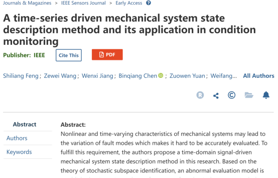 该论文题目为“A time-series driven mechanical system state description method and its application in condition monitoring”,我校开云体育 21级智能制造专业学生冯世亮、王泽伟、蒋文茜为共同第一作者,联合厦门大学、众泰汽车等单位共同署名,指导老师为该班班主任孙维方博士。论文提出了一种基于时域信号的系统描述方法并成功将其应用于滚动轴承、加工刀具状态监测等场景,为相关关键技术装备的运行维护和故障诊断提供了一条新的可能。
