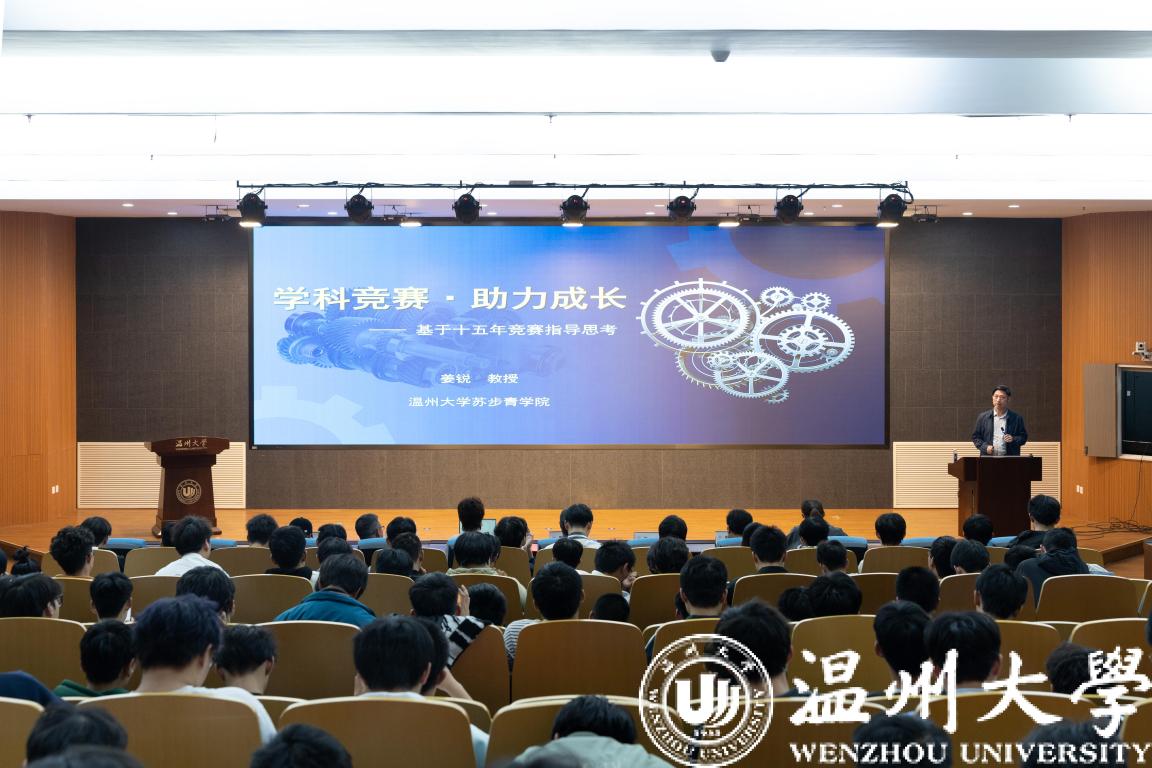 大会第四项议程:大咖会客厅(第2期)。温州大学苏步青学院执行院长姜锐教授就社会创新问题发表了独到见解,鼓励同学们培养创新思维。同时,姜锐教授还从“道、法、术、器、势、合、融”展开,讲解了学科竞赛的方法。