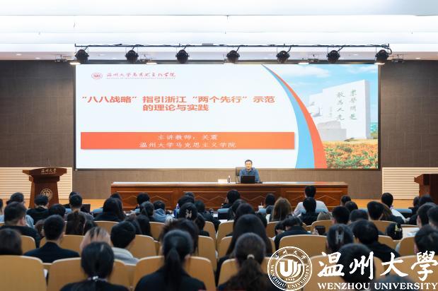 开班典礼结束后,温州大学马克思主义学院关震老师进行本期培训的第一场主题为《“八八战略”指引浙江“两个先行”示范的理论与实践》的专题讲座。关老师重点强调了以习近平新时代中国特色社会主义思想为指导,在高质量中奋力推进中国特色社会主义、共同富裕先行和省域现代化先行,分析了“八八战略”指引着“两个先行”的内在逻辑,并着重说明“八八战略”指引着温州“两个先行”的发展,主要介绍了浙江省第十五次党代会会议内容和意义,强调了“两个先行”是浙江省域发展的鲜明特征,是改革开放以来历届省委鲜明的战略指引。希望同学们贯彻落实浙江省第十五次党代会的实践要求,让浙江成为省域现代化先行者,为全国乃至世界探路!