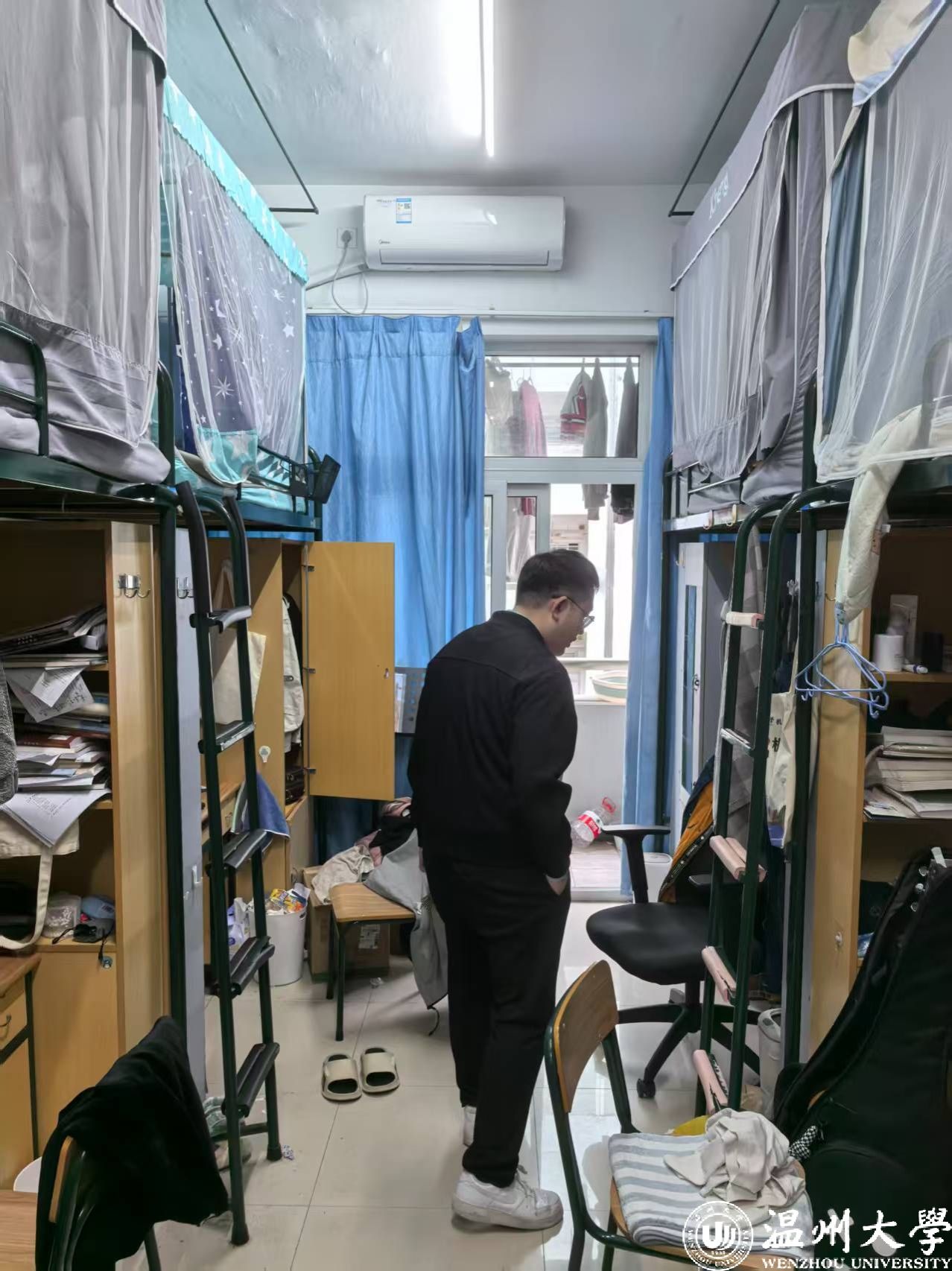 为贯彻落实学校《温州大学学生公寓管理规定》,3月14日下午国际化教学部开展3月份学生安全抽查活动。当天,专业辅导员对中外合作24级学生宿舍进行安全卫生抽查检查,确保学生公寓与安全管理工作的顺利开展。