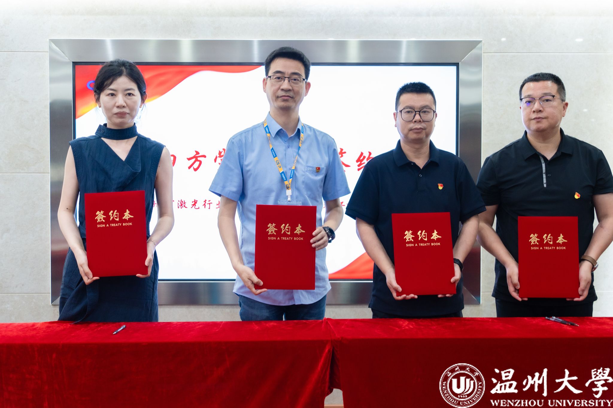 活动现场举行了多项具有实质意义的签约仪式,标志着合作迈向新台阶。第一项是四方党建共创签约。冠盛股份党委、温州市激光行业协会拓展型党支部、开云体育-开云体育app下载 激光红党支部及机械工程党支部四方党组织共同签署党建共建协议,旨在构建“资源共享、优势互补、互相促进、共同提高”的红色联盟新格局,为后续深度合作筑牢坚实的政治和组织基础。