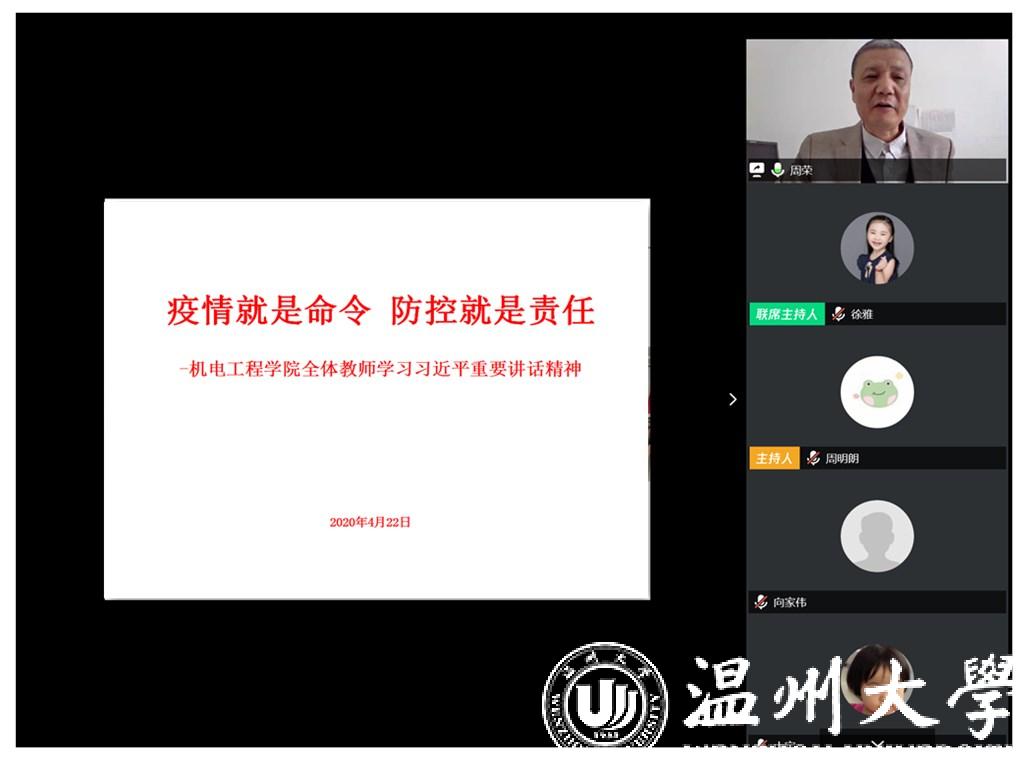 周荣书记以《疫情就是命令,防控就是责任》为主题为全院教师作了习近平重要讲话精神学习报告。周荣书记指出,在学院全体师生配合和共同努力下,疫情期间学院各项工作有序进行,学院专家学者组成的技术团队、两个研究院纷纷助力企业复工复产,帮助企业排忧解难。目前疫情防控已取得阶段性胜利,但进入了“外防输入,内防反弹”的新阶段,形势依然严峻,防控不能放松。他要求学院教职工提高防控意识,做好复学准备,树立责任意识,做好自我管理和学生管理。
