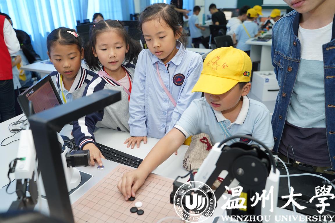 温州大学城附属学校学生先后参观了学院Dobot机械臂实验室、虚拟教学(VR)实验室和机器人模拟室。同学们观察了3D打印过程、开展了人机五子棋比赛和虚拟现实(VR)体验等,最后参观了学生科技成果展示厅,同学们对这些科技成果展现了浓厚的兴趣,还纷纷在展厅的荣誉墙前合影。