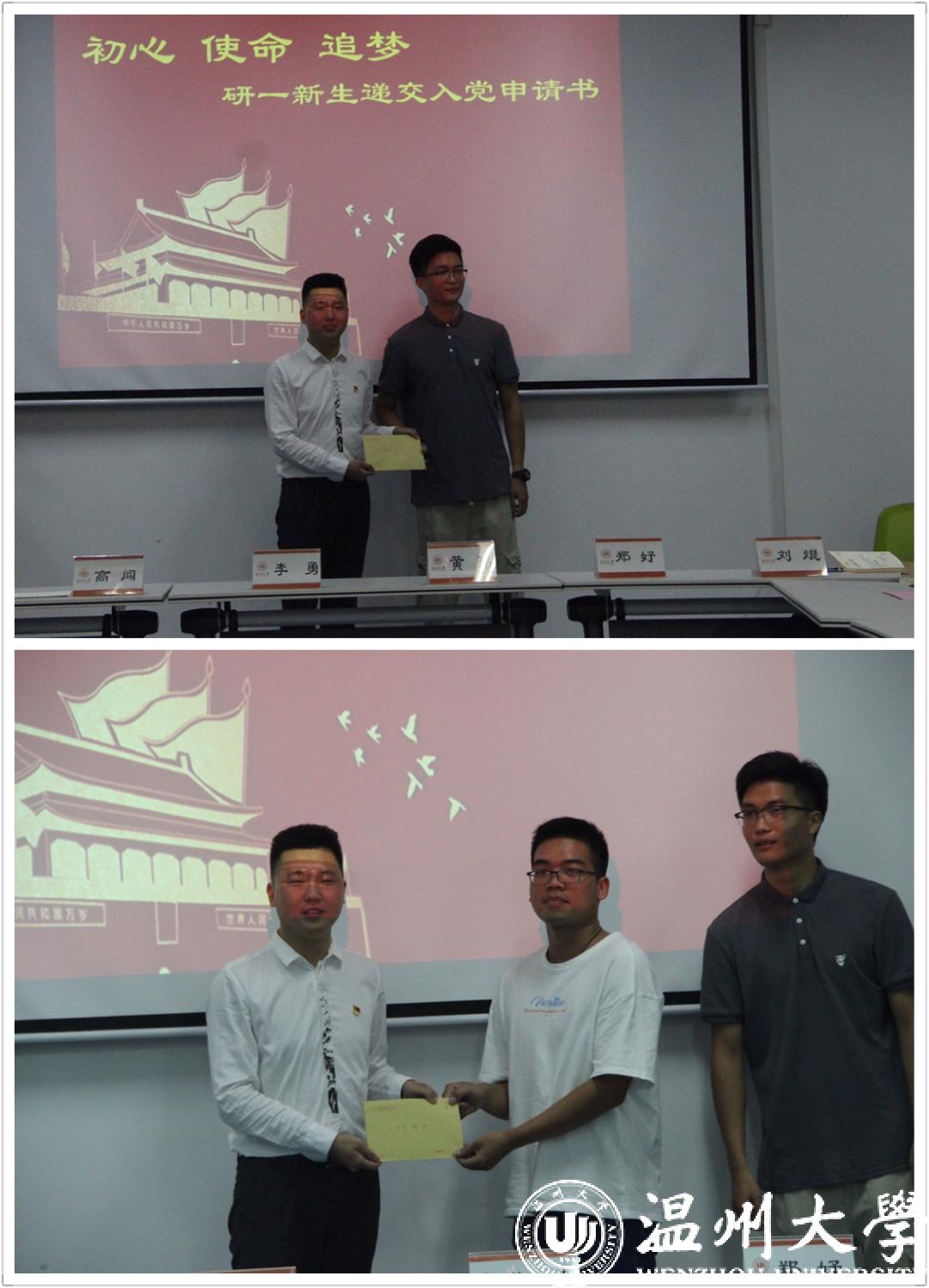 开云体育 研究生党支部书记、获奖团队成员之一的刘焜同学向我们分享了自从递交入党申请书到现在成为一名党支部的书记的成长经历,他表示党员要起到先锋作用,时刻冲锋在前,一直坚持党员的标准来对照自己,此次参加比赛,困难重重,比赛方案改了又改,但最终都坚持了下来而并没有放弃,依靠的就是一份信念,而这份信念来源就是他加入中国共产党以来的成长经历。刘琨同学的分享给在场的同学们一身正气,在场的同学们更坚定了要积极向党组织靠拢的决心,研一新生黄锦森和曾麟同学在现场主动向党组织递交入党申请书,表达他们想要积极加入党组织的强烈意愿,想早日成为一名有思想有灵魂有本领的社会主义接班人。