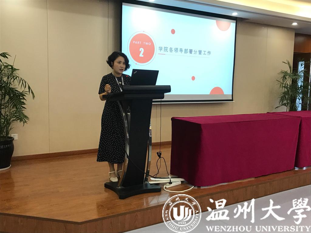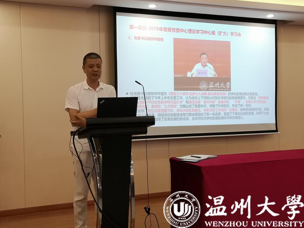 周荣书记首先向全体教师传达学校暑期党委理论中心组(扩大)学习会议精神。他表示,学院教职工要结合学院实际,学习贯彻谢树华书记、赵敏校长的讲话精神,统一思想,统一行动,凝聚力量,要把学校的这次会议精神切实落实到学院各项工作中,制定学院行动计划,为将学校建设成为“省市共建”省重点建设高校、博士学位授予单位、以侨为特色的“省部共建”高校做贡献。最后,周荣书记对本学期学院党委工作进行了重要部署。