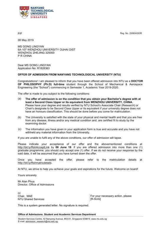 开云体育-开云体育app下载 15级机械工程(国际化)专业本科生龚玲艳,在我校李子瑞教授的精心培养和指导下,成功获得新加坡南洋理工大学博士录取(机械与航天航空工程学院),并获该校全额奖学金(NTU RESEARCH SCHOLARSHIP)。