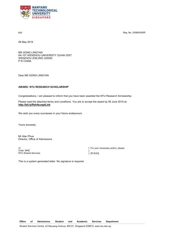 据悉,直博生全称为本科直博生,是指在应届本科毕业后,跳过硕士研究生阶段,直接以博士研究生身份攻读博士学位。通常来讲拥有直博生选拔的学校实力都非常强,基本集中在985工程院校和极少数211工程院校的优势强劲学科,教育部每年在全国的直博生选拔名额仅有不到500人左右,因此竞争强度很大。而南洋理工大学(Nanyang Technological University),简称南大(NTU),是新加坡的一所世界著名研究型大学。其最新QS世界大学排名第12名, QS世界年轻大学排名连续多年位列第一。龚玲艳作为一名普通本科毕业生能够收获南洋理工大学伸出的直博橄榄枝,并且获得该校全额奖学金(每月2000-2500新元,折合人民币约10000-12500元),实在难能可贵。这也是我校加强本科教育,始终坚持以本为本,重视人才培养的结果。
