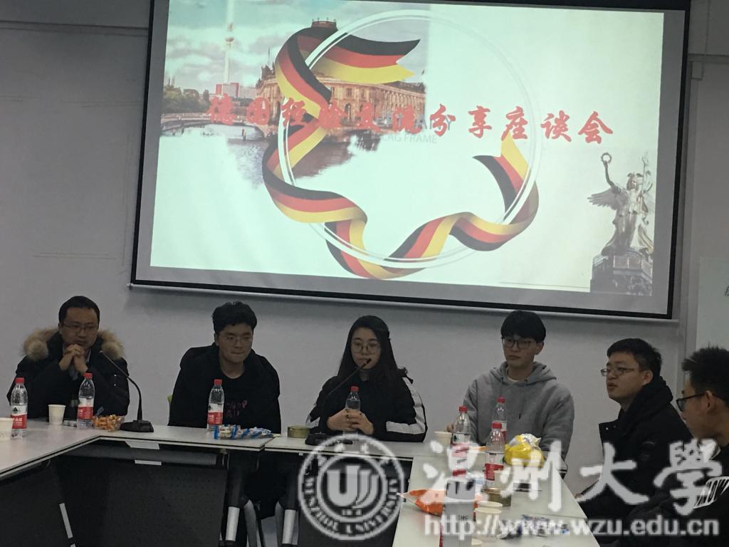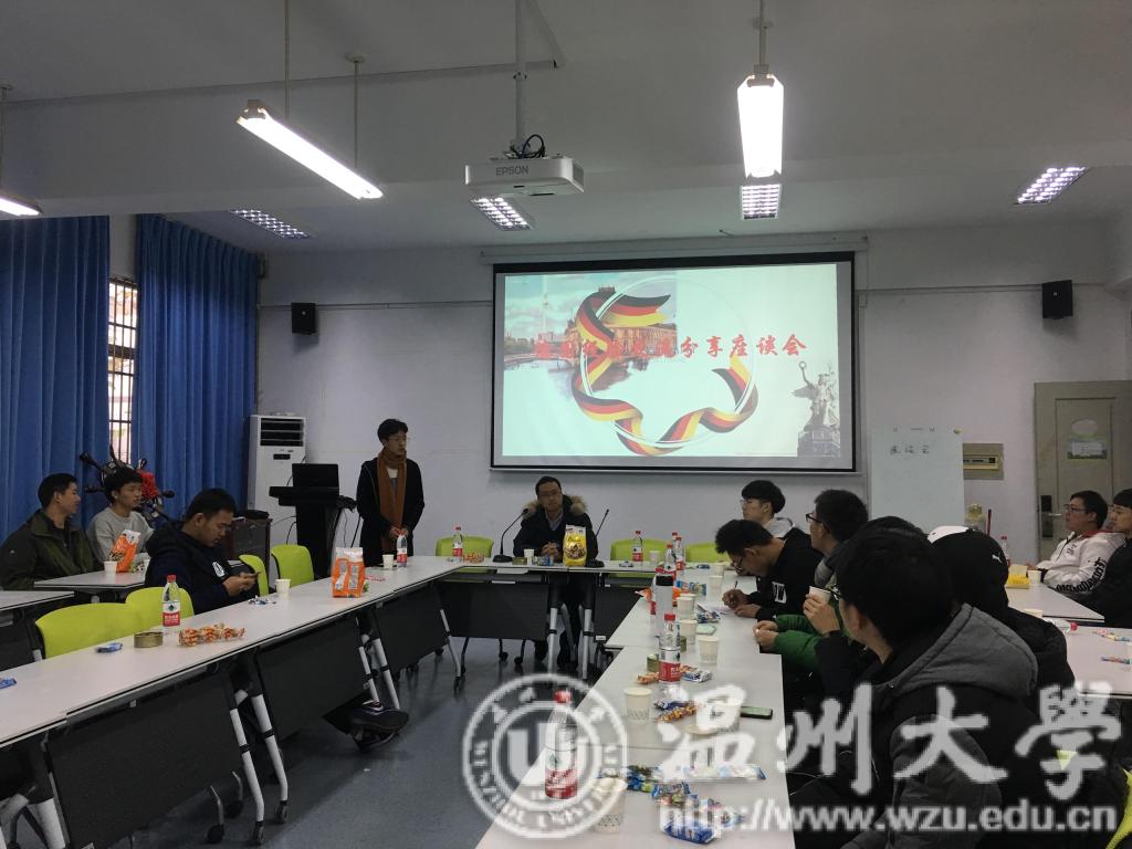 座谈会在主持人的陈词中正式开始。首先,储军老师以一份详细的ppt介绍了这项跨国学习项目,储老师从参加条件、项目内容、接轨的德国院校等方面分别对项目进行了详细阐述。紧接着,赴德学生精心准备的结业视频让大家对这项项目有了更充分的认识,视频中展示了学生们在德国的学习、生活等各个方面的经历。随后同学们边吃着准备好的甜品边与学长学姐聊天,大家畅所欲言,在德国的所见所闻所得成为了大家关注的焦点,也将会议推向高潮,其乐融融。