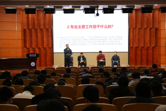 之后安排了师生问答环节,机械工程系周晨主任、工业工程系黄沈权主任和车辆工程系龙江启主任就新生们关心的专业、就业和考研等问题进行了详细的解答,共回答了学生关于培养目标、专业前景、专业方向、考研、学生科研、竞赛、海外交流实习、企业实习和就业等72个问题,加深了对学院三个专业的理解。