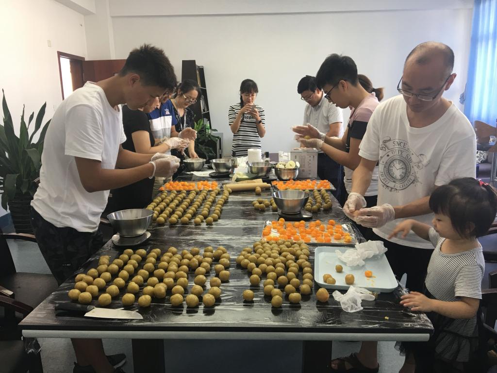 月饼是中秋团圆必不可少的美食。在活动现场,王晓倩老师一步步教给大家制作月饼的做法,从取出浸泡在油里的新鲜咸鸭蛋黄开始,饼皮和面、称重分割、包馅压模、烤制冷却包装,并印上带有“温州大学”、“求学”、“问是”、“敢为人先”等字样的图案,经过一阵忙碌,托盘上便整齐排列了一个个待烘焙的月饼。看着自己亲手制作的月饼,成就感油然而生,老师们纷纷拿出手机与自己的作品来个亲密合影,整个活动在一片欢声笑语中结束。