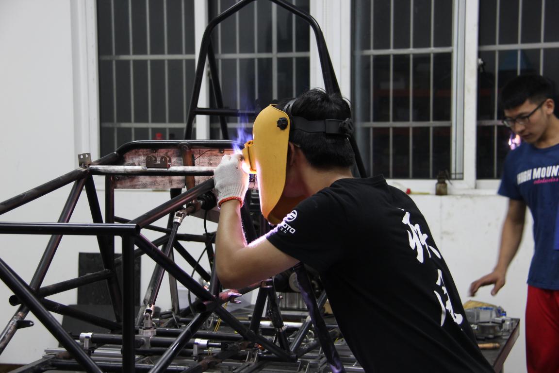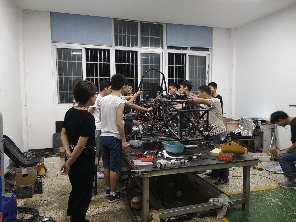 暑假期间,春风动力疾风车队的成员们始终坚守在自己的岗位上,没有丝毫懈怠。接连数月,他们一直处于紧张的工作之中。在每一位疾风车队的成员身上都能看到因为疲惫留下的痕迹,但他们无暇顾及这些,他们的眼中只有发动机、传动、悬架。“疾风1号”落地的前几天,车队成员夜以继日,不断调试车上的各个部件,屋外连绵的阴雨似是与车间里的队员没有丝毫的关系,因为无论在里还是在外,他们都会是全身湿透的。汗水的味道夹杂着夏日雨水的芳香迸发出别样的气息,用这些来浇灌此时炙热的大地,它长出的必将是成功的果实。