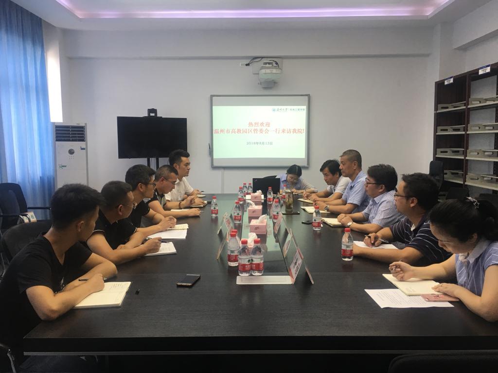 院长周宏明代表学院对高教园区管委会一行的到来表示欢迎,并就学院的学科科研建设、科学研究成果、研究院发展情况等几方面进行简要介绍。
