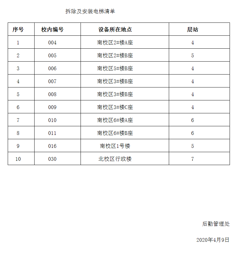 因学校老旧电梯更新工作需要,从4月11日(周六)起,逐步对以下电梯(详见清单)进行旧梯拆除及新梯安装施工,预计更新安装完成时间为5月中旬以前。届时,电梯安装位置有大型部件设备进出,电梯井道临时封闭。施工期间,请大家不要靠近电梯施工区域,以免发生危险。