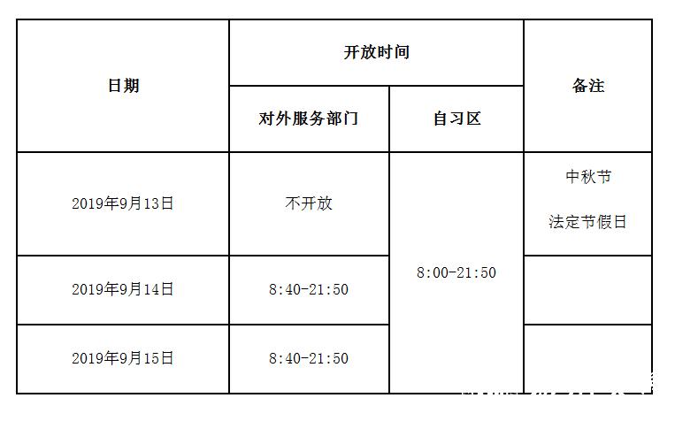 根据本学期校历表安排,图书馆中秋节期间开放安排如下: