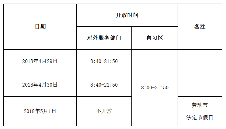 根据本学期校历表安排,图书馆五一节期间对外服务时间安排如下: