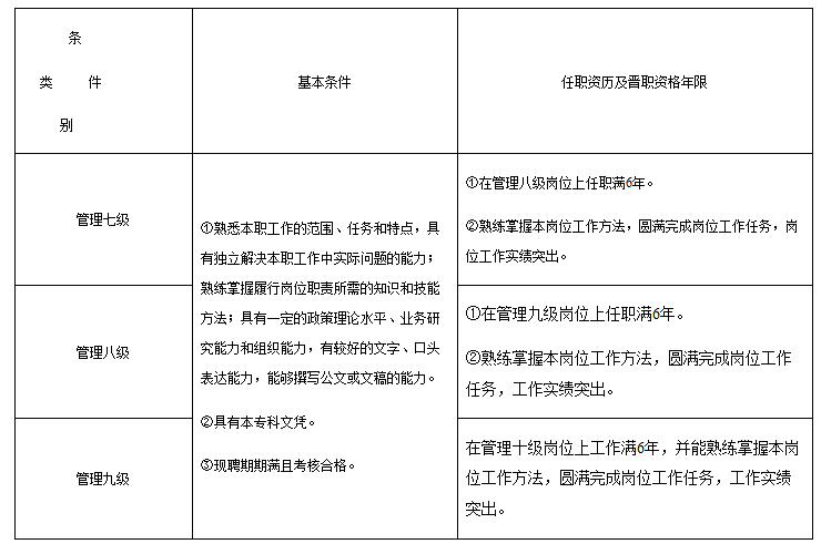 4.各级岗位竞聘基本条件、任职资历及晋职年限如下: