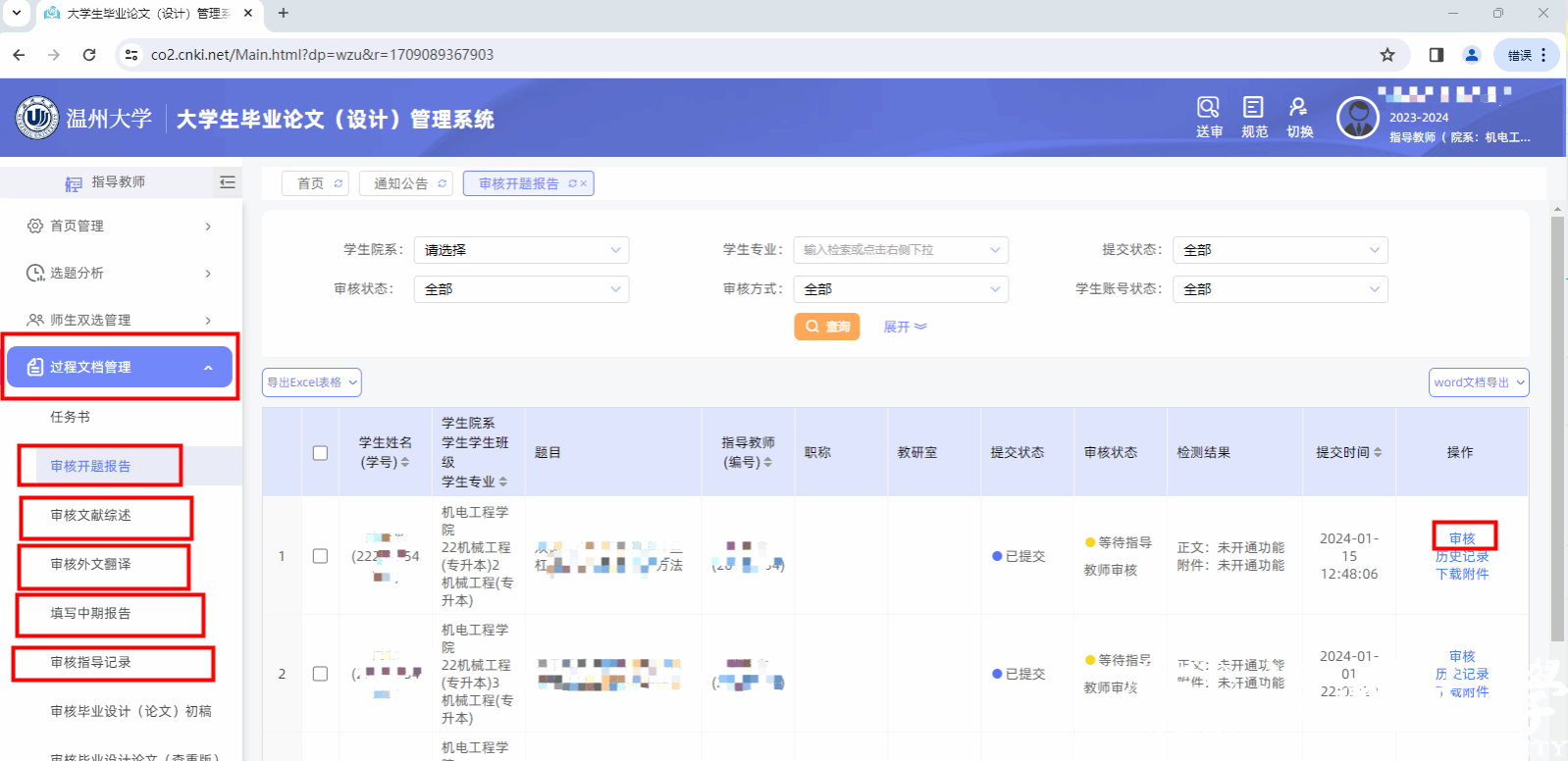 3. 点审核开题报告,进入界面后显示学生提交的开题报告内容(内容标题等已经配置为学校表格样式),各项内容均支持教师选中并批注,学生账号下可以同步看到批注内容。