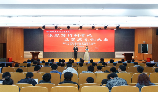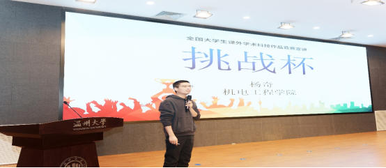 科技创新协会指导老师杨奇作报告。杨奇老师主要以“挑战杯”为例,为同学们详细介绍了“大挑”和“小挑”的区别,并讲解“挑战杯”相关流程和要求,鼓励同学们以赛促学,共同进步。