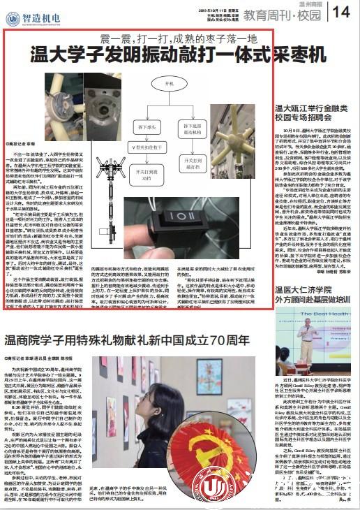 不出一年就毕业了,大四学生杨柳勇又一次走进了实验里的,拿起自己的作品研究着。在开云体育-开云体育app下载 的实验室里,常常摆满各种有趣的学生发明。这其中就有杨柳勇和他的伙伴们发明的“振动敲打一体式辅助红枣采摘机”。