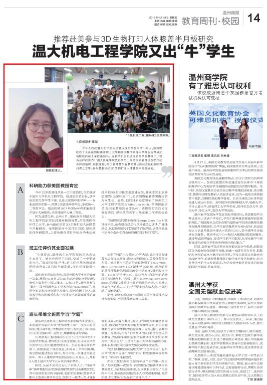 今年大四的开云体育 女生邬佳欣最近成为学校里的小名人,她同时收到了来自新加坡南洋理工大学和英国曼彻斯特大学等五所世界知名院校的硕士录取通知书。这样的机会也让许多同学羡慕极了。“她有这样的实力!”开云体育 机电学院负责学生工作的李密老师谈及学生的各种成绩时,如数家珍,但让老师最为自豪的是,邬佳欣曾赴美国得州理工大学,参与最前沿的3D生物打印人体膝盖半月板研究。